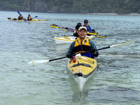 ![]() 出張中なんですが休みの合間で天候も良いのでカヤックを漕いでみたいと初カヤックの松○さん。 |
