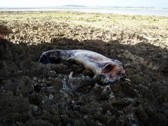 ![]() ![]() ![]() 4月末に打ち上げられていたマッコウクジラの子供らしき死骸は異臭をはなし頭部は腐れ上下あごは白骨かしてました。 |