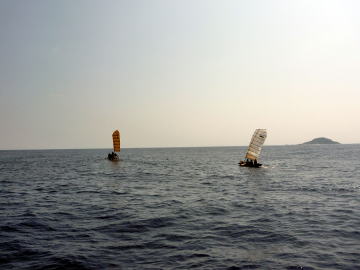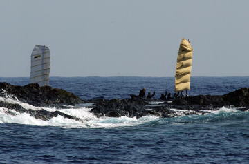 ![]() ![]() クルーメンバーチエンジ 右:ゴール手前追い風追い波で源丸がローリングで帆があばれバラスを何度も崩しました。 |