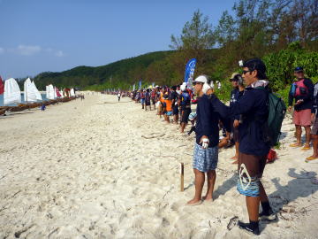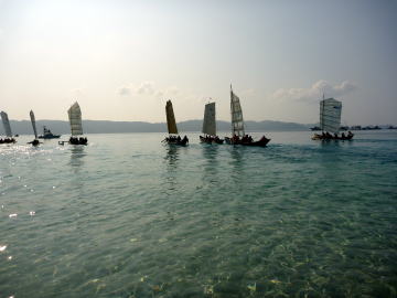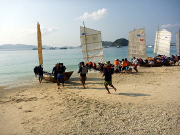 ![]() ![]() 全員一気にサバニを押していっせいにスタート |