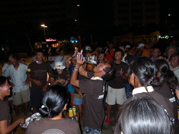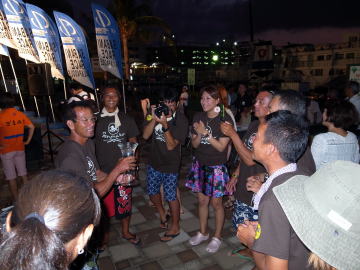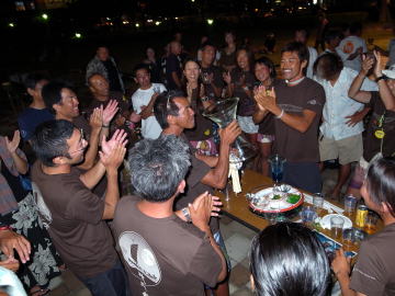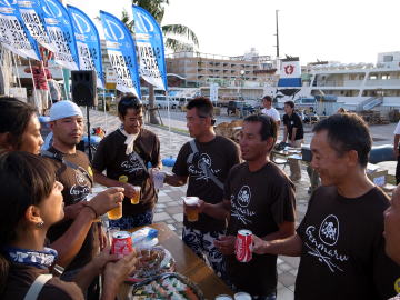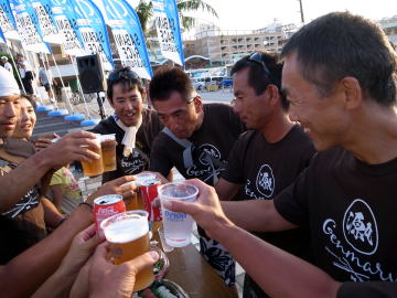 ![]() 大会終了、表彰式それぞれの部門での優勝・準優勝カップに泡盛にビールをいれて乾杯! |