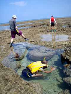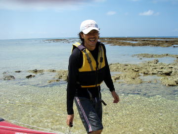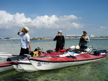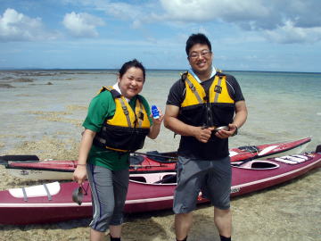 | 北海道からの参加者です。 出張で沖縄まで来て、海にも行かないのはもったいない! でも3時の便で北海道に帰っちゃいます。 「ちょっとでもシーカヤックにシュノーケリングしたい」と・・・ 「リクエストにお答えしましょう」 「お二人の為に時間ギリギリまで海遊びをしましょう」 と言う事でマジギリギリまで遊びました。 |