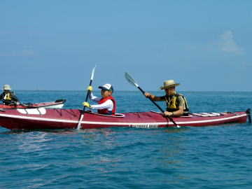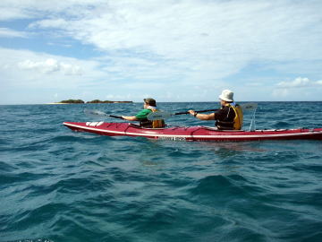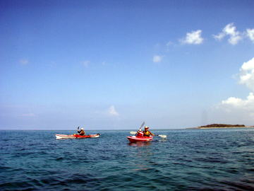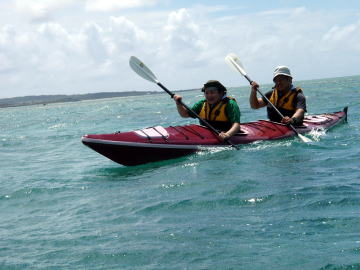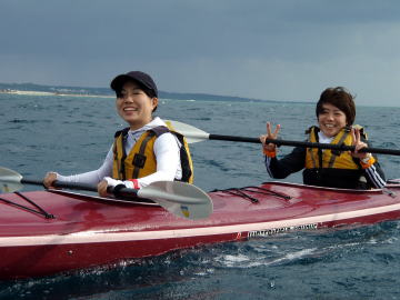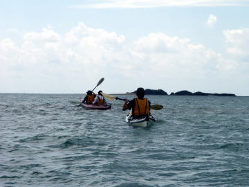 何回、予約を入れたのでしょうか?その度に台風!時化! ようやくシーカヤックにチャレンジできた谷○さん親子です。 この日は瀬長島より岡波島往復を漕ぎきりました。 |