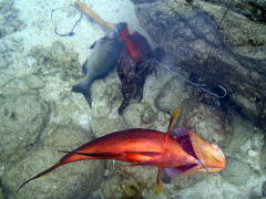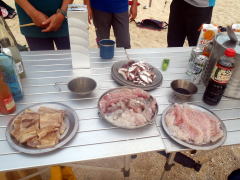 ![]() ![]() ![]() 各自釣った魚をさばいて、刺身にしあらや中骨は魚汁にしました。 |