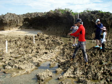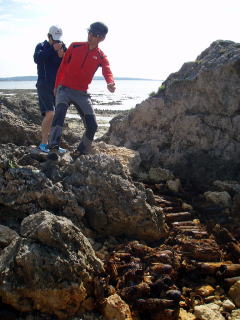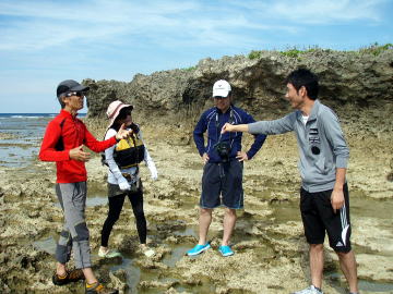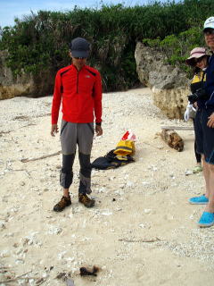 ![]() ![]() 左:鯨の化石の前で 右:「ほらっ!これ触ってみ〜」とヒトデを突き出す。 |