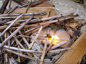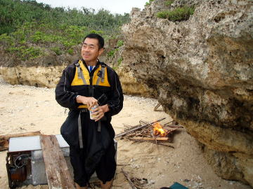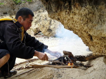 ![]() ![]() やっぱり肌寒い! 直火は浜が荒れるので下に石を敷き詰めて波打ち際にある竹や小枝を火種にする。 岡波島の浜辺は焼夷弾の火薬がいっぱいあるので雨の中でも焚火も簡単に着火。 |