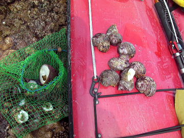 ![]() 幻のリーフで1時間ほどかけて拾ったサザエ そのサザエはツアー終了後 行きつけの“寿司処にふぇーでーびる”に持ち込み調理してもらいました。 |