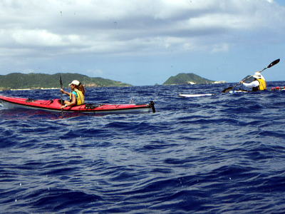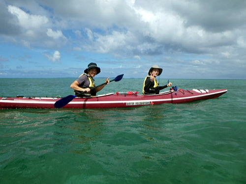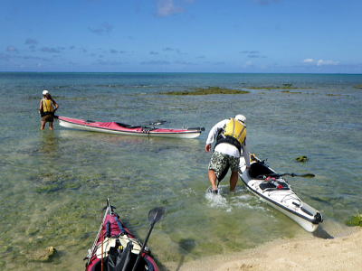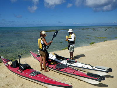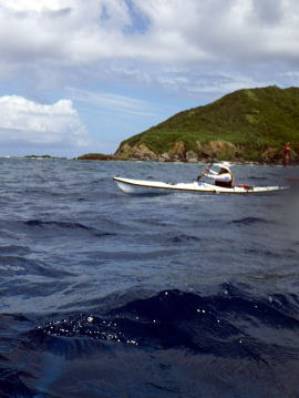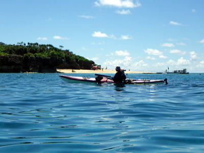 今日は風もなくベタ凪、思い思いで見通し内でそれぞれ漕いでもらいました。 相変わらずコマカ島は観光客でいっぱいです。 ちょっとビキニ姿を覗きに行ったお二人です。 |