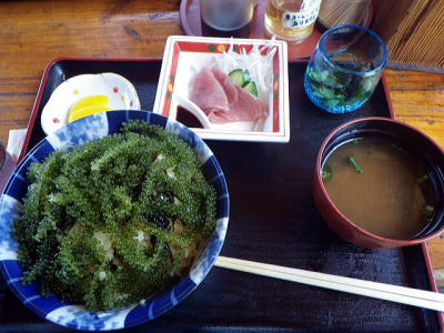 ![]() 島に行ったら地物を食べなきゃ〜 海ぶどう丼、魚汁に鮪の刺身にもずく酢が付いて千円也 |