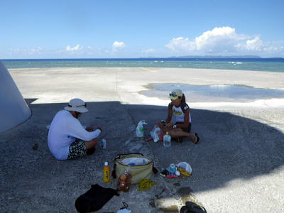 ![]() ![]() ルカン礁での日陰は灯台の下だけです。 それぞれ行動食を食べてます。 今日の行動食はサーターアンダギーにスパムおむすび、ゆで卵、バナナ、トマト、 魚肉ソーセージ、ゼリー状の運動補助食品、大好きなオリオンビール。 休憩時間2時間戻るのはもったいなく やっぱりキャンプしたい。 |