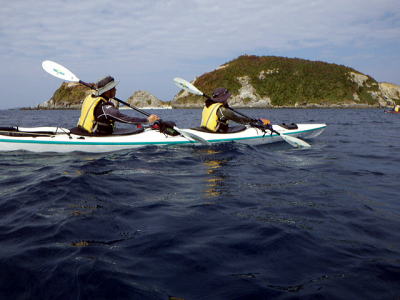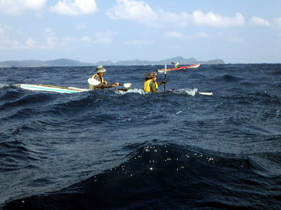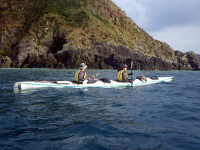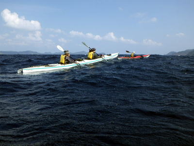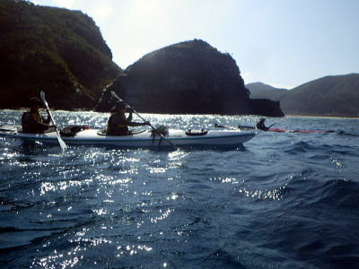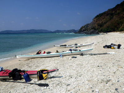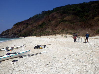 | 2日目:まだ北東の風が強い、しかも波は昨日よりも高くまずはハナレ上陸し、 その後 ビールと氷に水の補給で阿波連経由その先は行ける所まで漕いでみようと・・・。 |