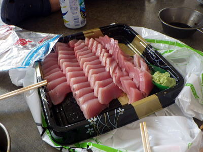 | 島に来たらやっぱり島物を食べなきゃ〜。 渡嘉敷漁協から鮪刺身を大量に購入し冷たいビールで乾杯!昼食。 1年分の鮪刺身を食べました。 |
