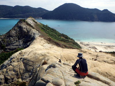 ![]() ![]() ハナレに来たら恒例のように頂上に登りケラマブルーの景色を見るのだがどうもテンポが遅い? おっと知らなかった〜 ○子さん高所恐怖症でこれ以上頂上に上がるのは無理のようでした。 右:それを気を使う岩○さん |