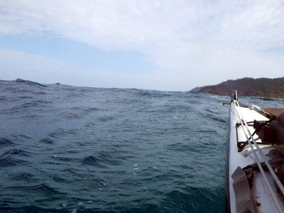 | 3日目:もちろん本日も冷たいビールと氷に水の補給をして 安室島に向かう事にしたが、渡嘉敷島から離れば離れるほど波は高く、 海峡真ん中行く手前でもう波も2mは超える波に風も北東からかなり吹いている。 「進路変更!これ以上行くと明日戻れない可能性もあるので渡嘉敷島を北上しキャンプすることに」 |