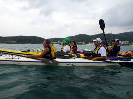 | 毎年恒例のBAJA横浜ツアー 週間天気予報では曇り雨なんだがあれ〜晴れている、校長の晴れパワー恐るべし。 このまま3泊4日良いお天気でいられますように。 天気はどうにかいい調子だが、 ツアー初日目から「自分ピーマン食べられないんですよ」 「青臭いから嫌いなんで青臭い野菜類は嫌いなんですよ」 更にもう一人は「トマトが嫌い」「ご先祖様から食べるな!と言われている」 更にもう一人は「酸っぱいものがダメなんですよ」 「私、人参嫌い!」 「私は椎茸がダメ!」 「私は何何が嫌い、食べられない、そんなの食べなくても大人になれるし良いじゃない。」 おっと大人の好き嫌いの言いたい放題が始まった。 「でもビールは一番大好き」って言う人ばかり。 「漕がなくていいから浜辺でずーっとビール飲んでいたいわ」 「でも阿嘉島まで行ってみたい」と言うリクエスト。 |
