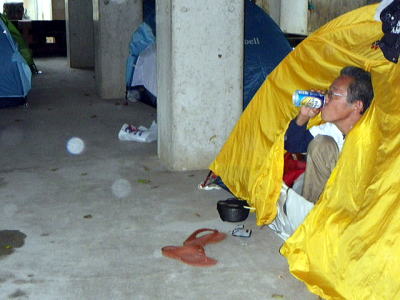 | 「セーフ」どうにか昼前にキャンプ場へ着、テントは屋根のある場所に設置。 その後、雷を伴う集中豪雨、移動して良かった〜。 |