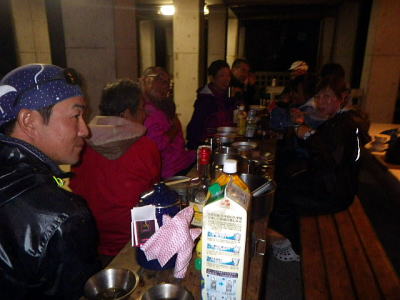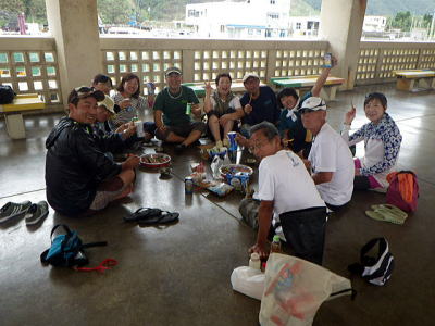 | 11月5日(月) 午前中に片づけを済ませて帰路の身支度 島に来たらやっぱり島物を食べようと漁協で刺し盛りを注文してフェリー出港時刻まで待合所で大宴会。 |