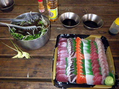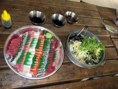 | 今日のハッピーアワーは渡嘉敷漁協の刺し盛りにナマコ酢ともずく酢 これもペロっと食べてしまいました。 |