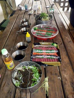 今回のツアーは漕店募集のゲスト4名様(2泊3日参加)と 千葉県にあるアウトドアショップZENさん(3泊4日)とのコラボツアーで ZENさんは漕店へ初ツアー参加です。 しかし、天候が今一つ・・・ 先週までは3日間晴曇りで4日間曇り雨の天候のリズムでしたが 季節の変わり目か今週からは2日晴曇りが3日曇り雨のリズムに変わってきた。 しかもその2日間が深夜をはさむ晴れ間なので1泊2日の無人島などのフィールドキャンプは厳しいと判断! 青少年交流の家キャンプ場を2泊3日ベースキャンプに慶良間の島々へDAYツーリングに出かけるツアーになりました。 ベースキャンプがあるとテントの設営に撤収が無いのでそのぶん時間が有効に使える。 有効に使えた時間はひたすら飲みの時間に・・・。 |