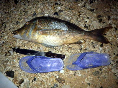 ![]() ギョサンが27㎝あるので約60㎝で約4~5㎏ぐらいのサイズ。 5名で食べるにはかなり多いな~。 |