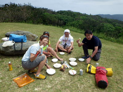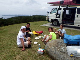 ![]() 山の頂上で慶良間諸島を眺めながら昼食 |