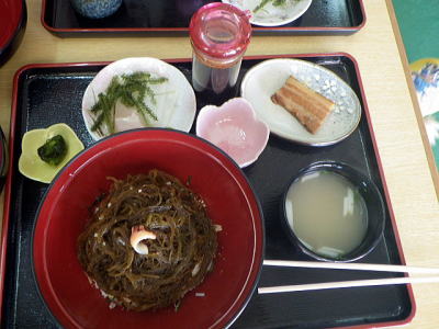 ![]() ![]() 左:ランチはモズク丼、ちらし寿司の上に今が旬のモズクがどっさり。 右:4月ですが夏日で木陰で休憩。 |