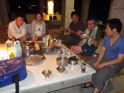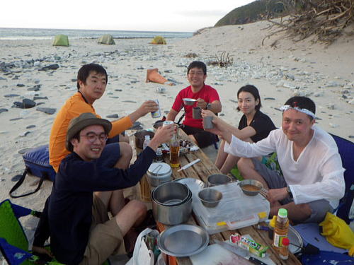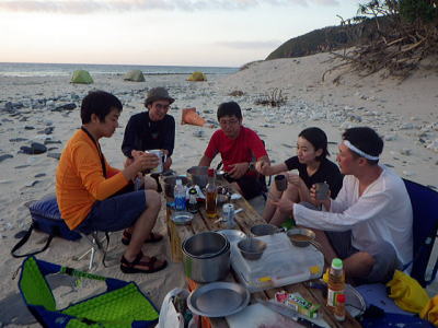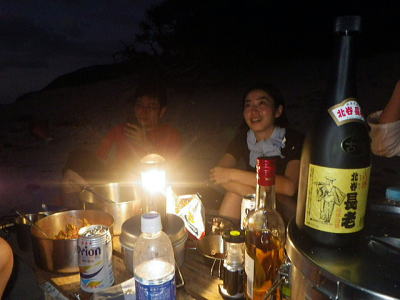 ![]() 夜の宴では荒波のなか漕いで帰ってきた話題が肴となる。 |