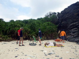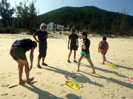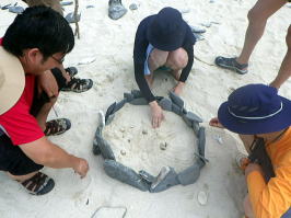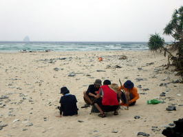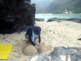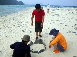 | 念願の無人島キャンプ 泡盛が進みます。 10月12日午前中 北東の風 上げ潮と風波がぶつかり野崎あたりはぐちゃぐちゃで潮目が出ている今出発すると危険リスクが高い! さて、どうしましょう? 渡嘉敷港まで漕いで行くか? 対岸まで渡りカヤックは林の中に置いて歩いて戻る? 上げ潮から下げ潮に変わる転流時まで待って状況を見てみる? 結果、転流時まで待ち午後に出発をする事に。 その間何をしましょうか? やっぱり遊びの達人たちは思い思いヤドカリを捕まえてきて石で囲いを作りヤドカリ牧場と言うか、 先に出たのが勝ちというゲームの開始。 |