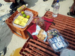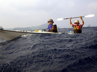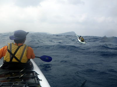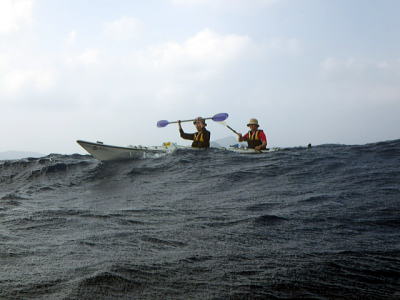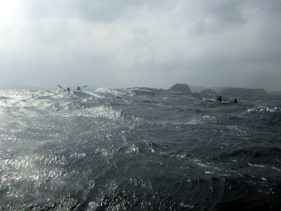 | スタート時はみんな緊張、船酔いしている場合じゃない。 しかし、追い風になり漕がなくても進となると気の緩みか船酔いを促す人が・・・ (写真を見てみるとたいした波じゃないみたいだね〜) |