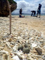 ![]() ![]() ![]() 岡波島上陸:早くも千鳥の産卵もありました。 貝を拾うもよし、焼夷弾の火薬を集めるもよし、ゴミ拾いをするのもよし。 |