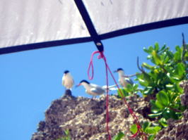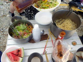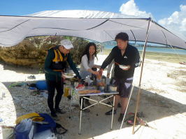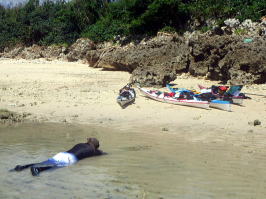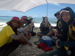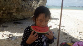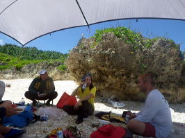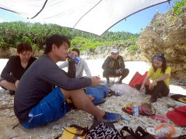 ![]() ![]() ![]() 岡波島到着の乾杯をして、マンゴー食べて、昼食終えてスイカ食べて・・・パインまでは食べれませんでした。 |