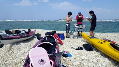 | 10月18日 RAINBOW 岡波島日帰りツアー (瀬長島南〜岡波島往復) 今日は3名様のゲストに3名のガイド。 贅沢なマンツーマンの日帰りツアーである。 |