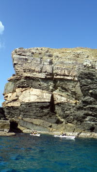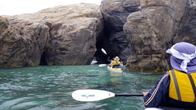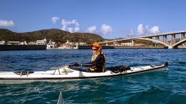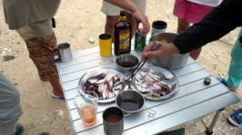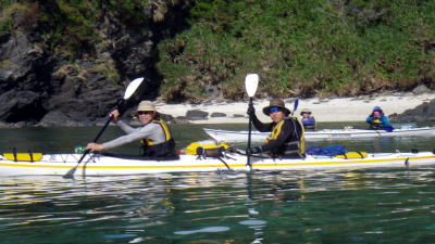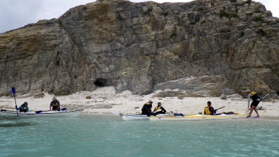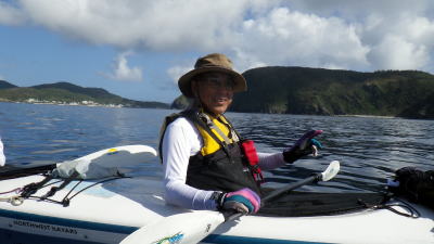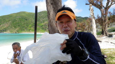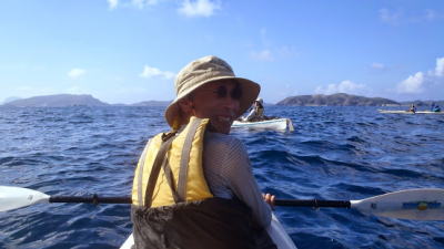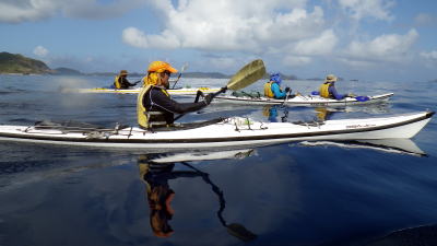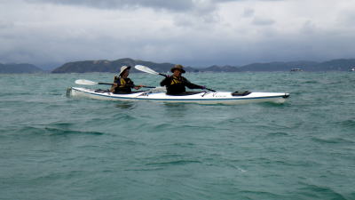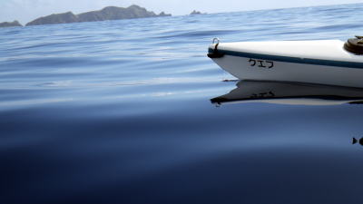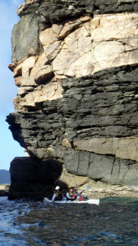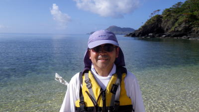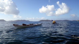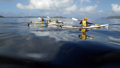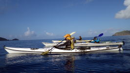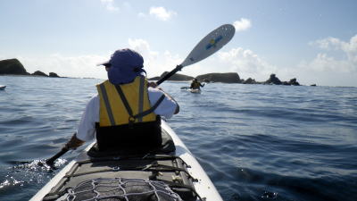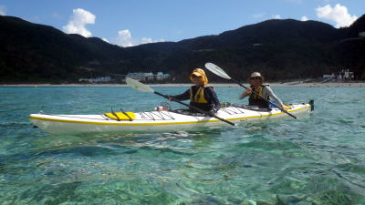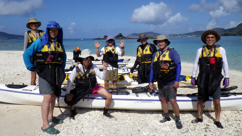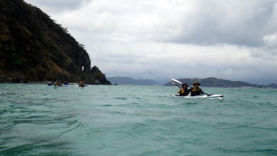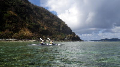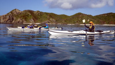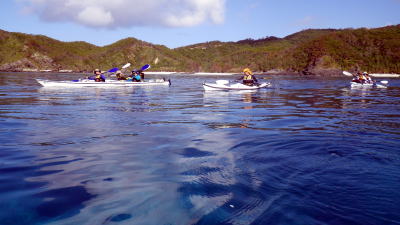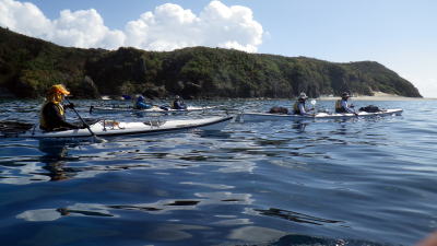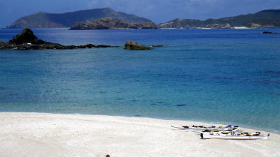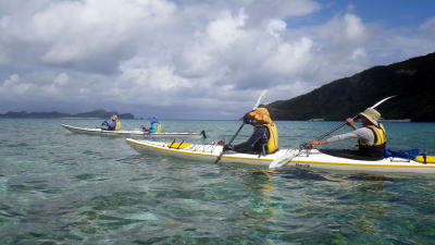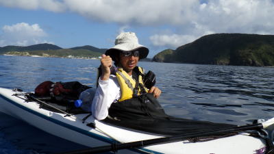 | 阿波連へ買い出しに行く際 上陸後 ラダーで怪我が発生! 急遽 渡嘉志久湾までカヤック2艇曳航して青少年交流の家でのキャンプへ変更。 3日目:昼過ぎ前線通過の予報。 渡嘉志久湾から阿波連ハナレへ往復。 行きはよいよい帰りは向かい風の強風! |