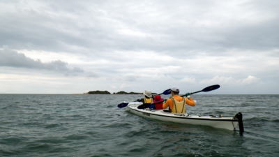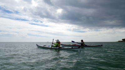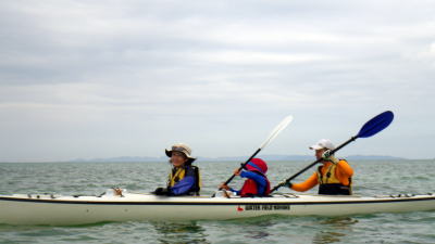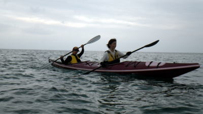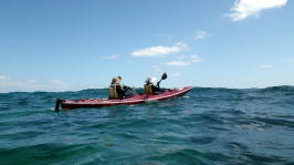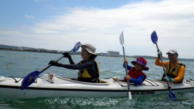 9月20日(日)岡波島ツアー 静岡県か漕ぎに来てくれた仲良し母息子。 行は母親がラダーマンで漕ぎ。 |