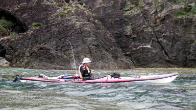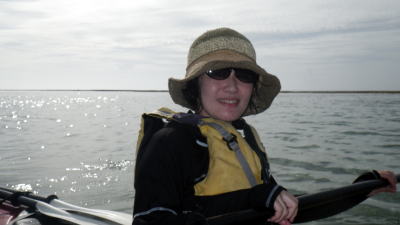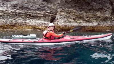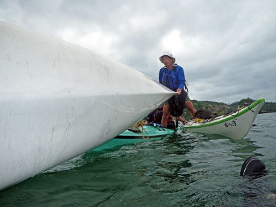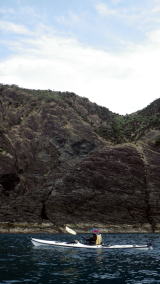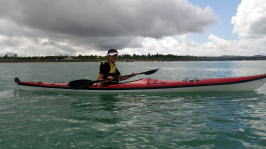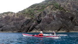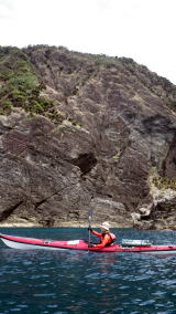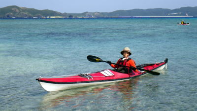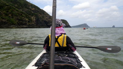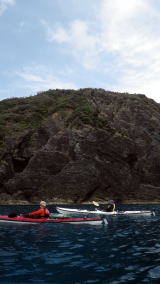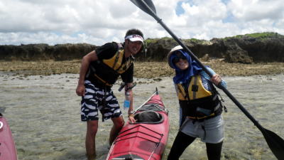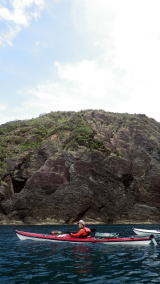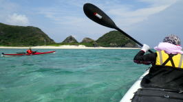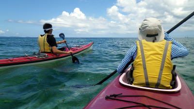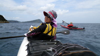 | 5月14日(土)午前半日ツアー 瀬長島〜岡波島往復 福岡からお越しの徳田さんと××さん 久々のシーカヤックでちょっとブランクがあるので・・・という事で 「では彼女は任せてください、徳田さんはシングル艇を思う存分好きに漕いできて」 |