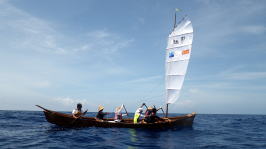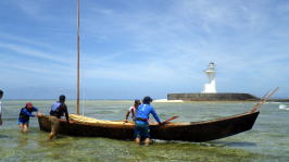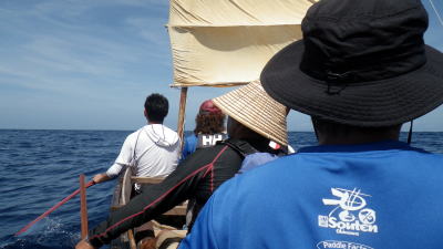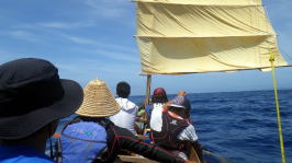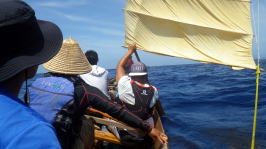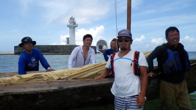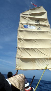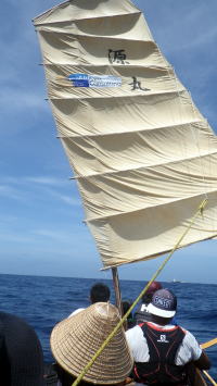 5月16(月)UP 旧暦4月10日 長潮 那覇の天候 梅雨入り初日目 28℃ 5月15日(日)沖縄本土復帰記念日 たまには帆掛けサバニも 今回はライバルチームのうみ丸と 糸満市から西10km先にあるルカン礁まで帆漕ツーリング 南東の風、ちょうどま追っての順風である。 約1時間30分で到着。 |