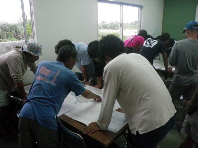 | 左:技術講習会場の月ケ浜(とぅどぅまり浜) 右:海図を使って方角や距離を測る座学講習 | |||||||||||||||||||