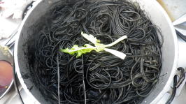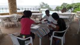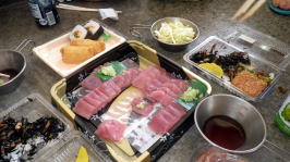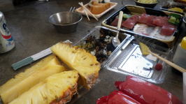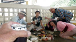 最終日、島で獲れた生鮪の刺身を昼食に乾杯! お疲れさまでした。 |