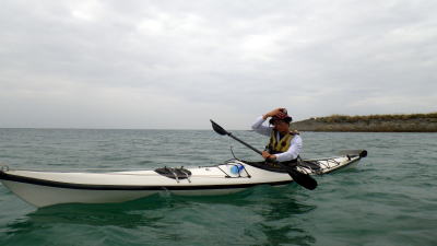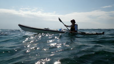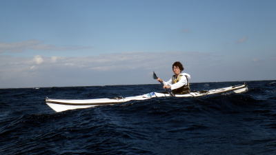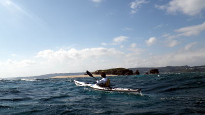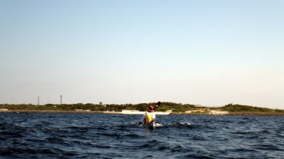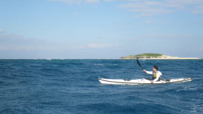 昼食:久高御膳をいただき海に行ってみると 晴は晴れだが波1mでも風波で右後ろからの追っての風で行よりもかなり強くなっていた。 追っての風なのでフェリーグライド漕行で時にはデッキを白波が覆っていく状況・・・ これこそ「行はよいよい帰りは恐い」って感じ。 そこは若さに長身を活かしたパドリングで2時間で戻る事が出来ました。 |