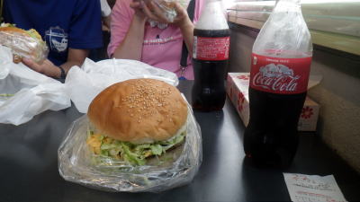 東村より南下しながら 金武町のキングタコスへ。 顔サイズのチーズバーがを食らう。 あまりの大きさで夕食が食べれない状態! なんてこった! |