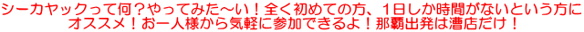 | 岡波岩コース | コマカ島コース | 久高島コース | 喜屋武岬コース | 那覇〜渡嘉敷横断! | |||