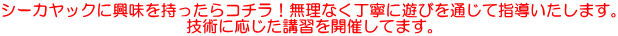 | 漕店オリジナルの教え方です。 これからシーカヤックを始める方に最低限必要なカヤックの基本的操作方法など講習します。 <フォワードストローク(前進)・リバースストローク(後進)・ スウィープストローク(方向転換)・セルフレスキュー(再乗艇)> |